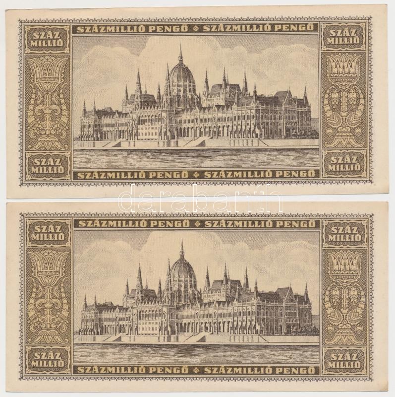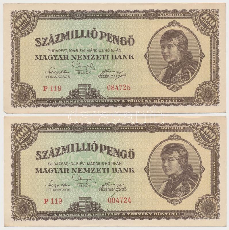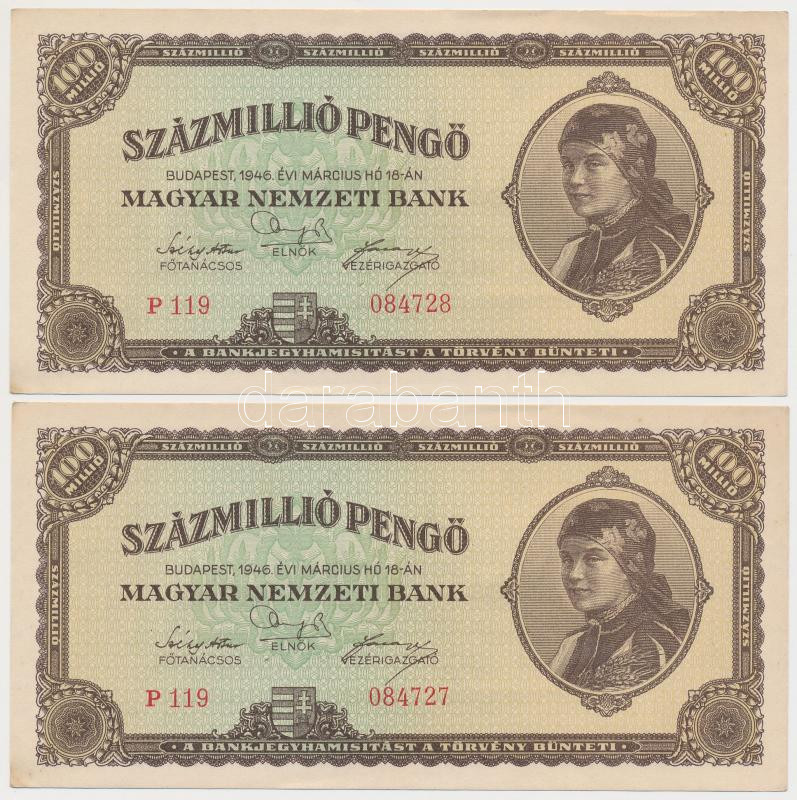 1946. 100.000.000P (4x) sorszámkövetők két ugrással T:I,I- https://www.darabanth.com/de/258-Fernauktion/258.0/Numismatik/Ungarische-Banknoten~400007/1946-100000000P-4x-sorszamkovetok-ket-ugrassal-TI-I-~II1268502