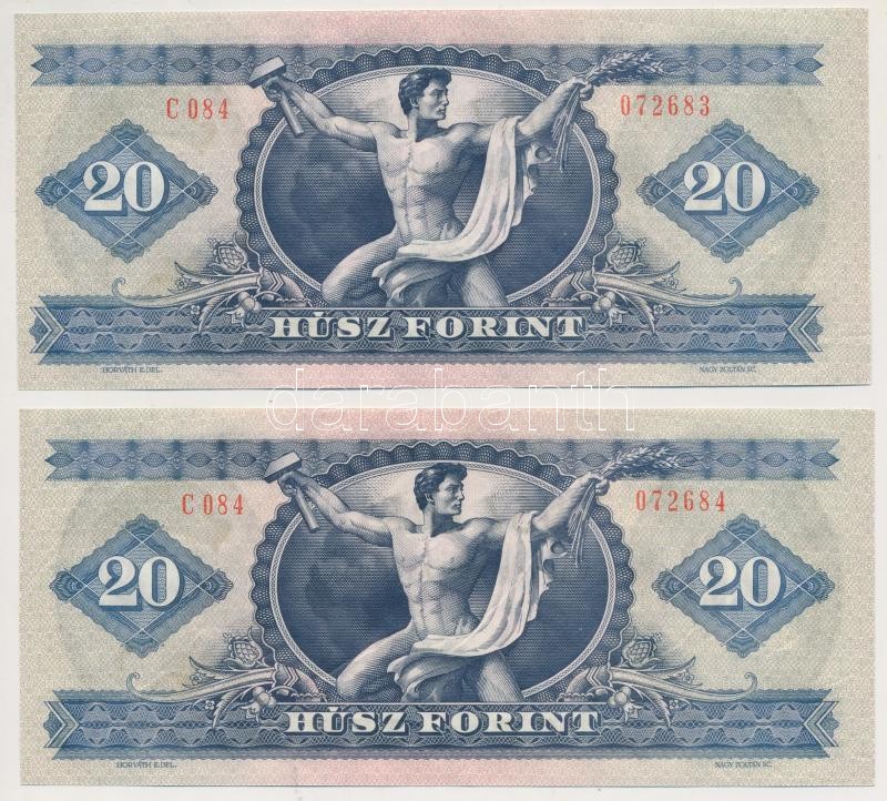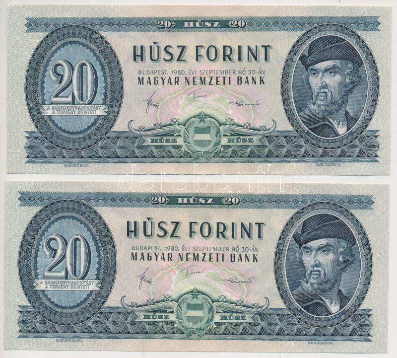 1980. 20Ft (2x) sorszámkövetők, nyomdai papírráncokkal T:I https://www.darabanth.com/de/258-Fernauktion/258.0/Numismatik/Ungarische-Banknoten~400007/1980-20Ft-2x-sorszamkovetok-nyomdai-papirrancokkal-TI~II1265204