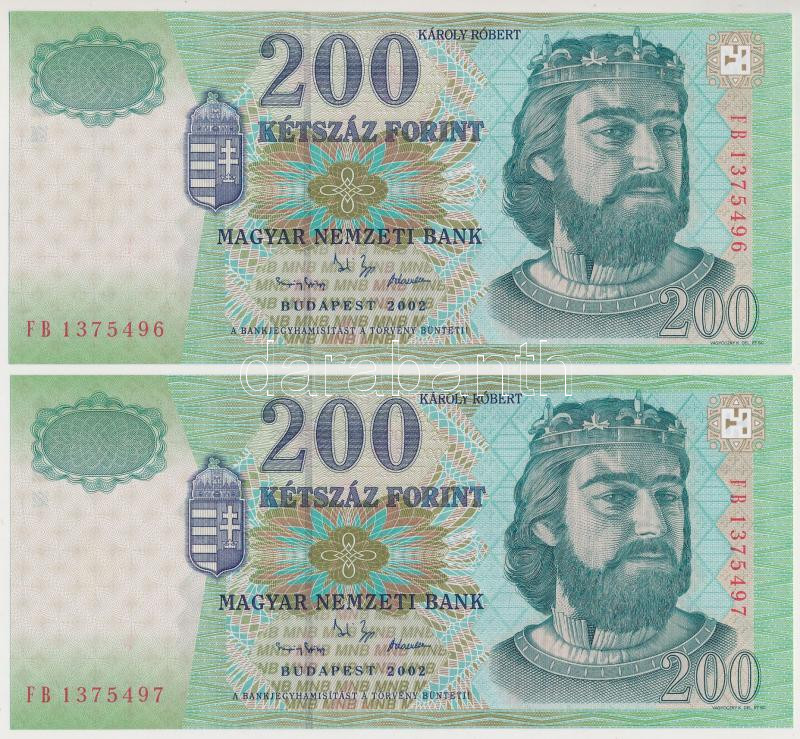 2002. 200Ft "FB" (2x) sorszámkövetők T:I https://www.darabanth.com/de/258-Fernauktion/258.0/Numismatik/Ungarische-Banknoten~400007/2002-200Ft-FB-2x-sorszamkovetok-TI~II1265224