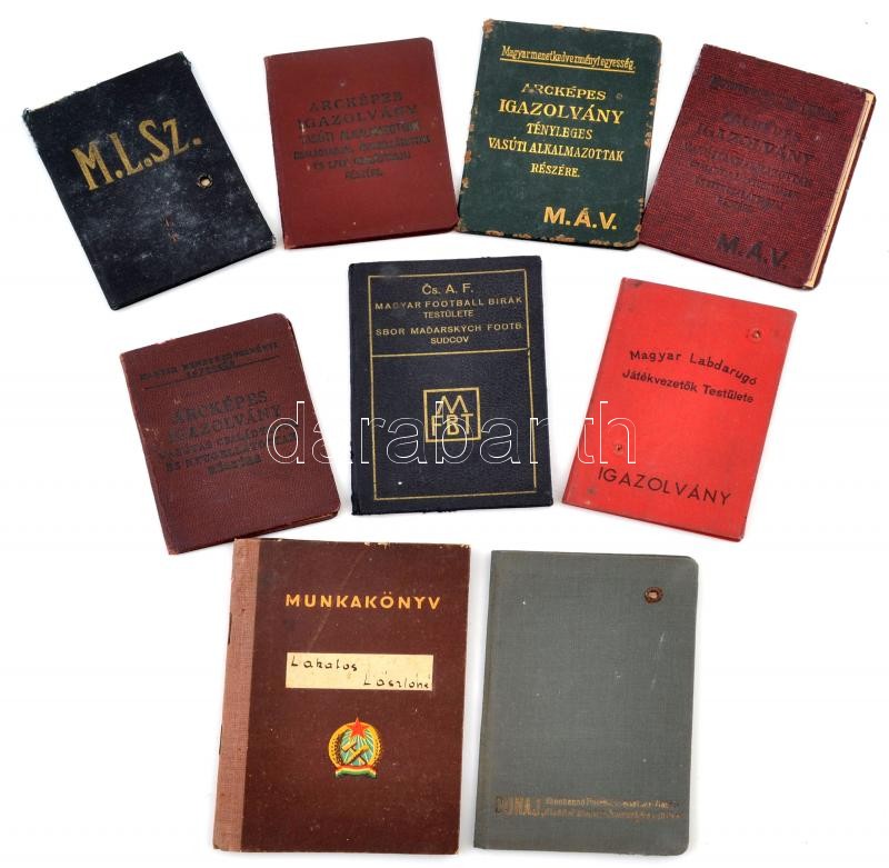 Beschreibung: cca 1922-55 Lakatos László labdarúgó játékvezető vegyes okmányai, benne MLSZ ig., Magyar Labdarúgó Játékvezető Testületének igazolványa, vasutas ig., stb. 7db, + a feleség Lakatos Lászlóné 2db okmánya, összesen 9db
