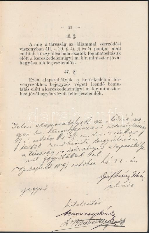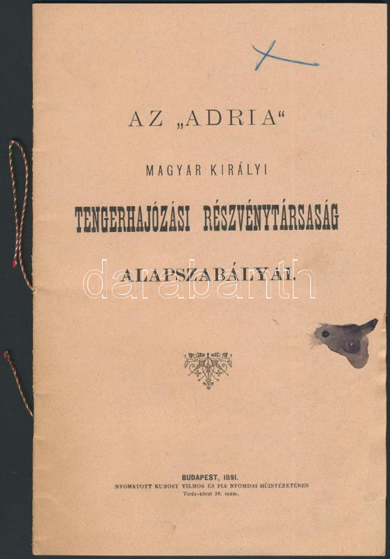 1891 Az "Adria" Magyar Királyi Tengerhajózási Részvénytársaság alapszabályai. A társasági elnök és mások saját kezű aláírásáva. Kis folttal a fedőlapon egyébként jó állapotban. pp.:23, 22x14cm