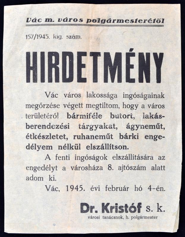 Beschreibung: 1945 Hirdetmény Vác város polgármesterétől, melyben az ingóságok elszállításának tiltását ismerteti. 27x21cm.