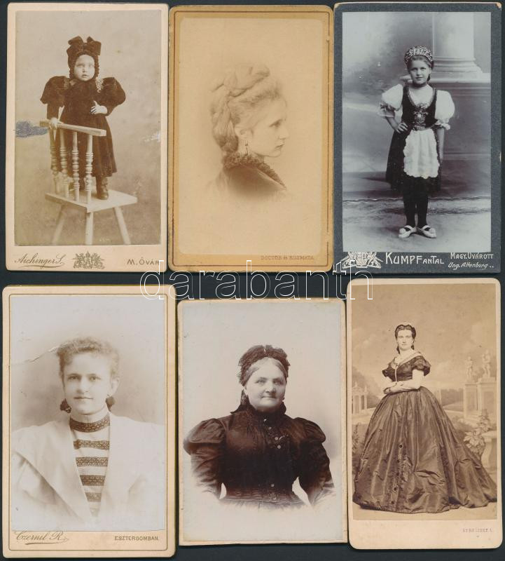 cca 1860-1890 Korabeli, keményhátú családi fotók,6db, különböző magyar műtermekből: Aichinger, Kumpf, (M. Óvárott), Doctor és Kozmata, Sterlisky (Pesten),Meinhardt (Pápa), Czernil (Esztergom) 11x6,5cm