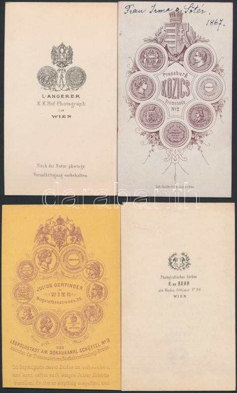 Beschreibung: cca 1860-90 Korabeli keményhátú fotók, 4db, különböző bécsi műtermekből: Gertinger, Bohr, Kozics, L. Angerer. 10,5x6cm