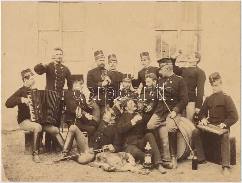 Beschreibung: cca 1890 Pécs, Vidám hangulat Zureich Károly fényképész műtermében, pecséttel jelzett, kartonra ragasztott vintage fénykép, 18x24 cm