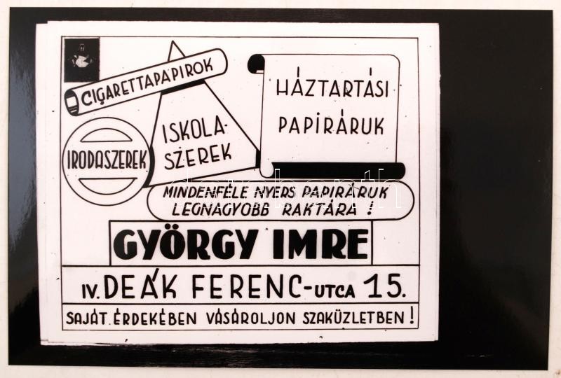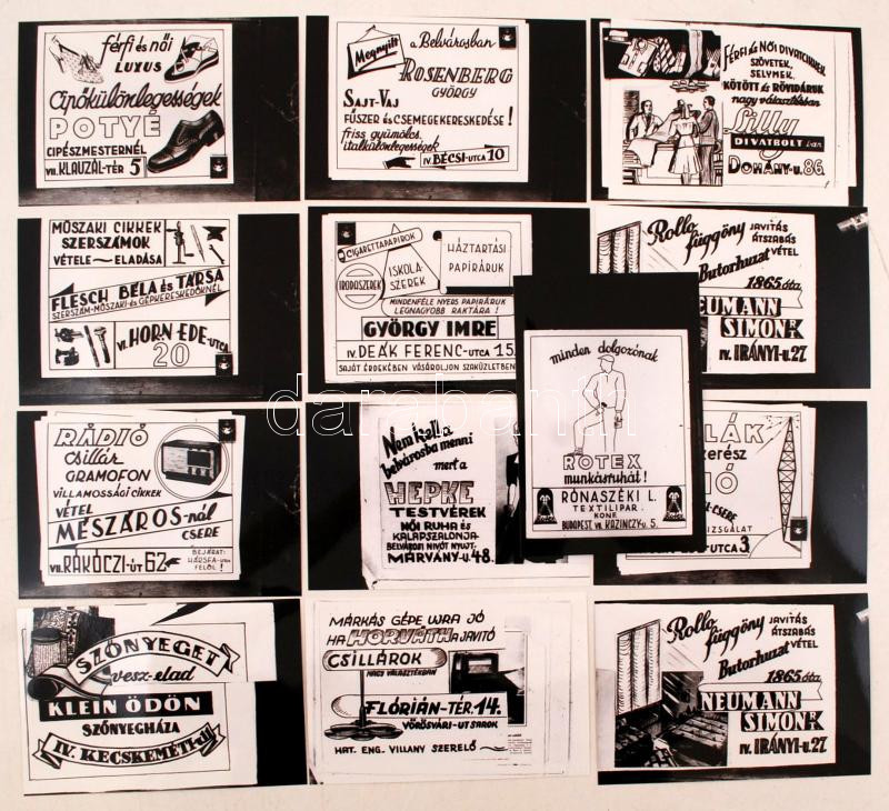 cca 1946 Fekete György (1904-1990) budapesti fényképész reklámgrafikái különféle szolgáltatásokról, termékekről, ezekről készített mozikban vetíthető üveglemez diapozitív képeket, az eladásra kínált tétel 13 db papír- pozitív képet tartalmaz, melyek modern nagyítások a hagyatékában őrzött korabeli negatívokról, 10x15 cm-es fotópapíron