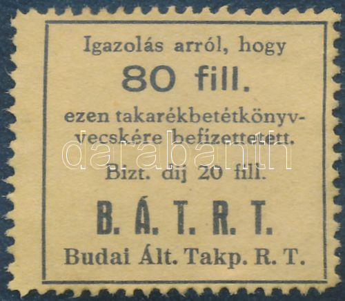 Beschreibung: ~1930 Budai Általános Takarékpénztár 80f befizetési bélyeg
