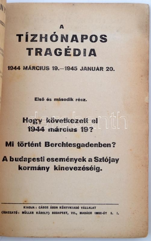Gyenes István-Kiss Károly (szerk.): A tízhónapos tragédia. 1944. március 19-1945. január 20. I-II. egybekötve. Dokumentumok és újságcikkek a korabeli eseményekből és sajtóból. Bp., 1945, Gábor Áron kiadás. 56 p. Kiadói papírkötésben.