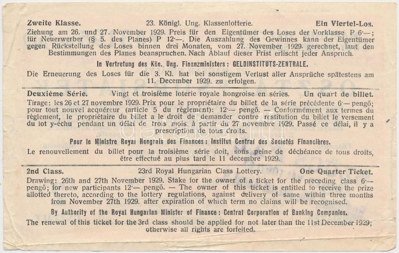 Beschreibung: Budapest 1929. "23. Magyar Királyi Osztálysorsjáték" 1/4 sorsjegy, második osztály, bélyegzéssel T:III