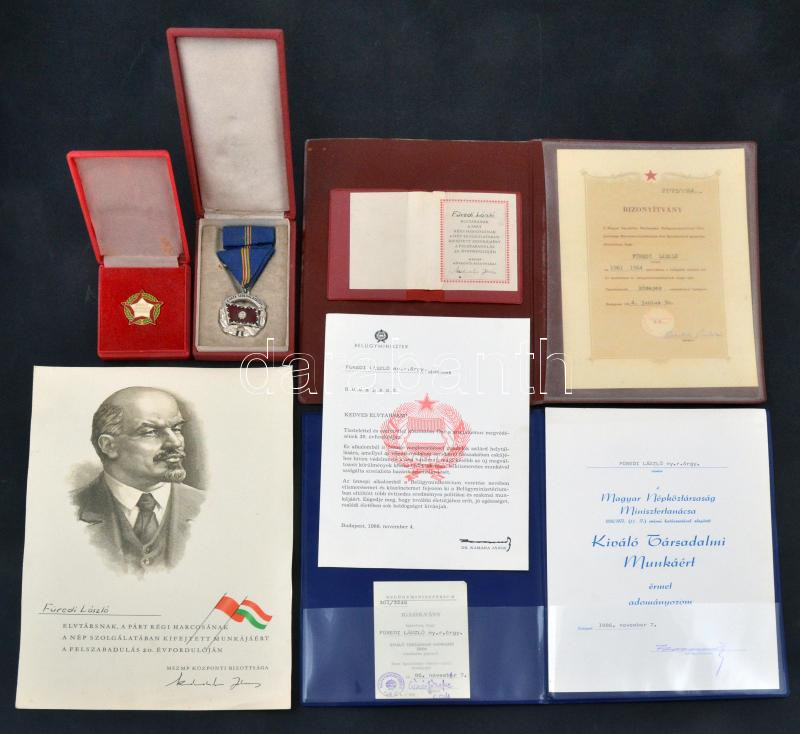 ~1960-1970. "A Haza Szolgálatáért" ezüst fokozat, ezüstözött és zománcozott fém kitüntetés, szalagsávval, dísztokban + 1986. "Kiváló Társadalmi Munkáért" zománcozott fém jelvény tokban, adományozói okirattal és igazolvánnyal + 4db szocialista okirat, adományozói oklevél, igazolvány és bizonyítvány T:1-,2