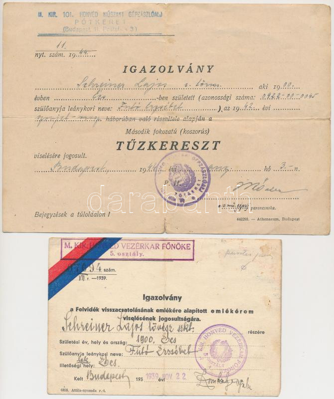 Beschreibung: 1939. "Felvidéki Emlékérem" viselésének jogosultságára igazolvány + 1944. "Tűzkereszt" viselésének jogosultságára igazolvány