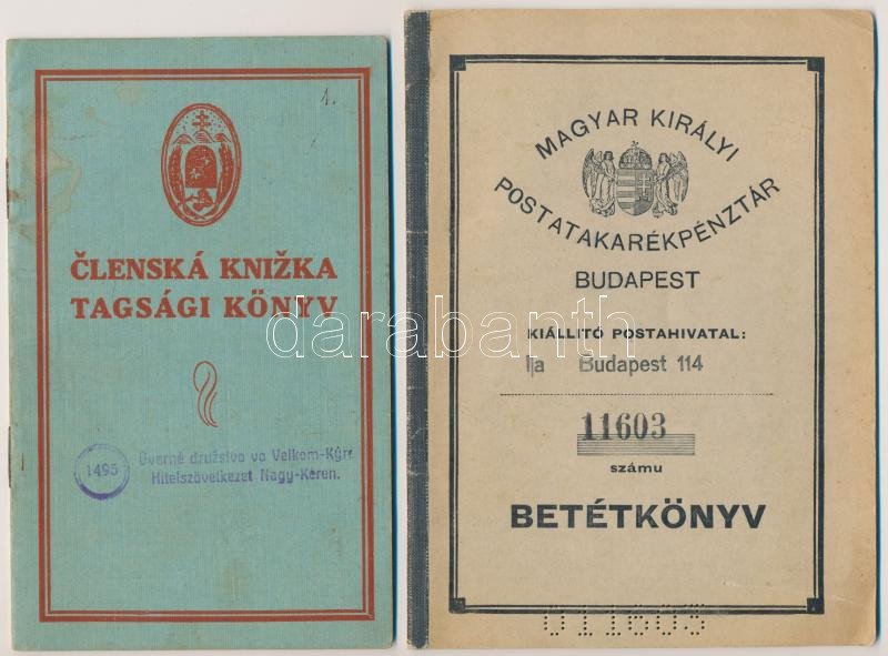 Beschreibung: 1898. "Hitelszövetkezet Nagy-Kéren" tagsági könyv + 1937. "Magyar Királyi Postatakarékpénztár" betétkönyve
