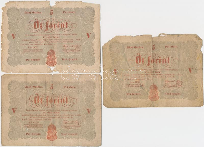 1848. 5Ft "Kossuth bankó" vörösesbarna (3x) T:III-,IV https://www.darabanth.com/de/259-Fernauktion/259.0/Numismatik/Ungarische-Banknoten~100008/1848-5Ft-Kossuth-banko-vorosesbarna-3x-TIII-IV~II1261028