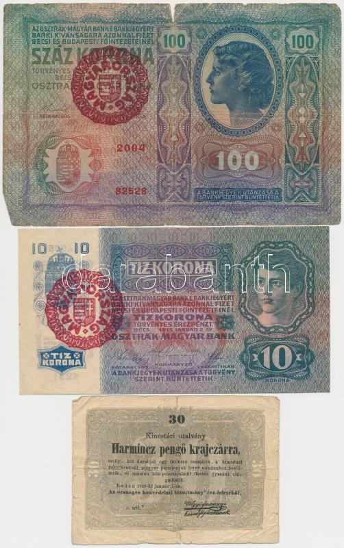 1849. 30kr "Kossuth bankó" + 1912. 10K piros "MAGYARORS... https://www.darabanth.com/de/259-Fernauktion/259.0/Numismatik/Ungarische-Banknoten~100008/1849-30kr-Kossuth-banko-plus-1912-10K-piros-MAGYARORSZAG-felulbelyegzessel-plus-1915-10K-piros~II1278428