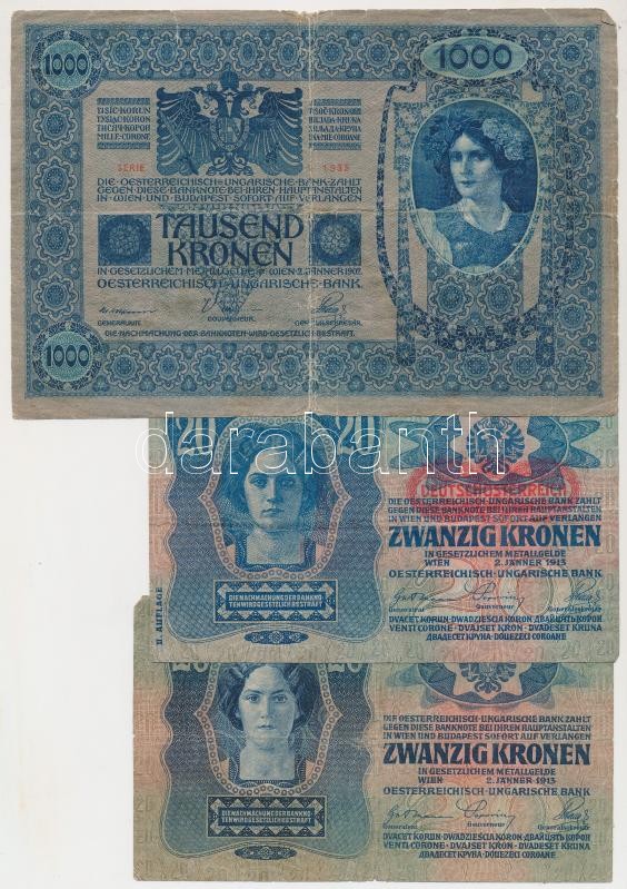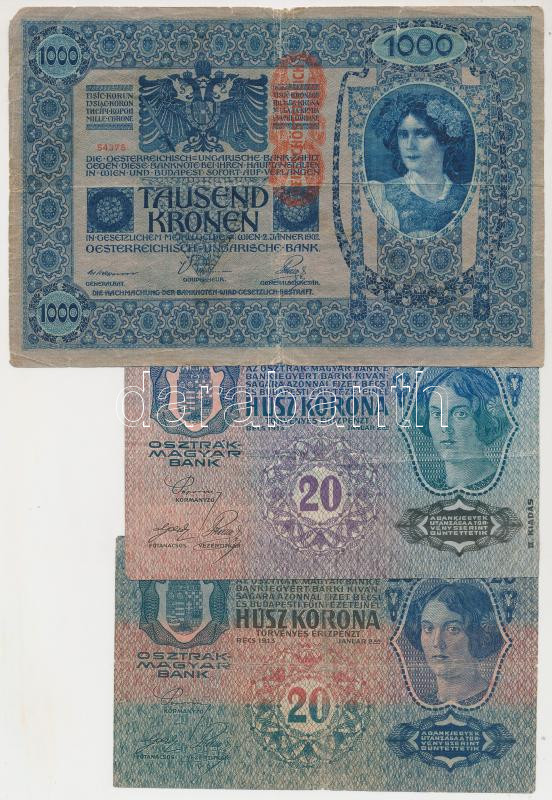 1902. 1000K piros "Deutschösterreich" bélyegzéssel + 1913. 2... https://www.darabanth.com/de/259-Fernauktion/259.0/Numismatik/Ungarische-Banknoten~100008/1902-1000K-piros-Deutschosterreich-belyegzessel-plus-1913-20K-plus-1913-20K-II-kiadas-piros-De~II935840