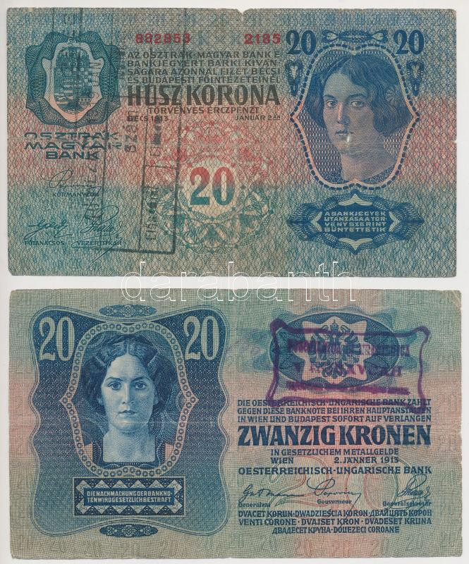 1913. 20K (2x) magyar és szerb felülbélyegzéssel T:III https://www.darabanth.com/de/259-Fernauktion/259.0/Numismatik/Ungarische-Banknoten~100008/1913-20K-2x-magyar-es-szerb-felulbelyegzessel-TIII~II1275631