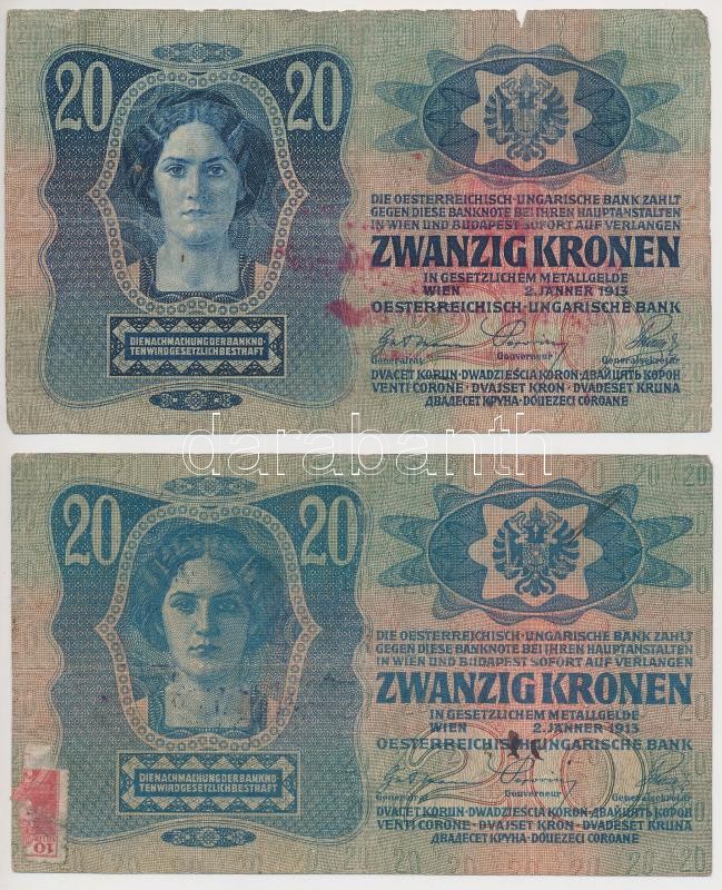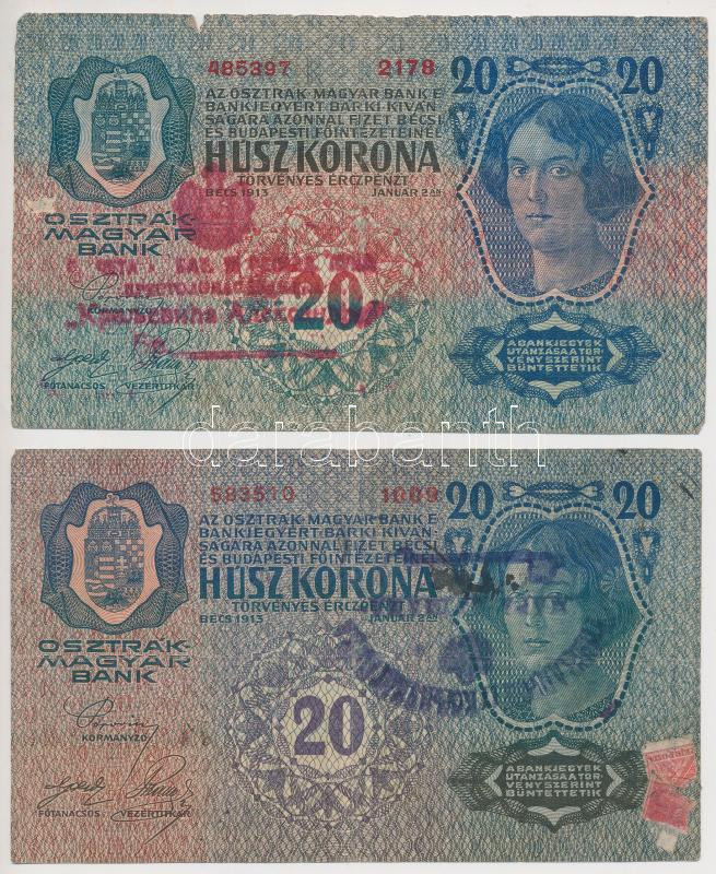 1913. 20K (2x) szerb felülbélyegzéssel T:III https://www.darabanth.com/de/259-Fernauktion/259.0/Numismatik/Ungarische-Banknoten~100008/1913-20K-2x-szerb-felulbelyegzessel-TIII~II1275639