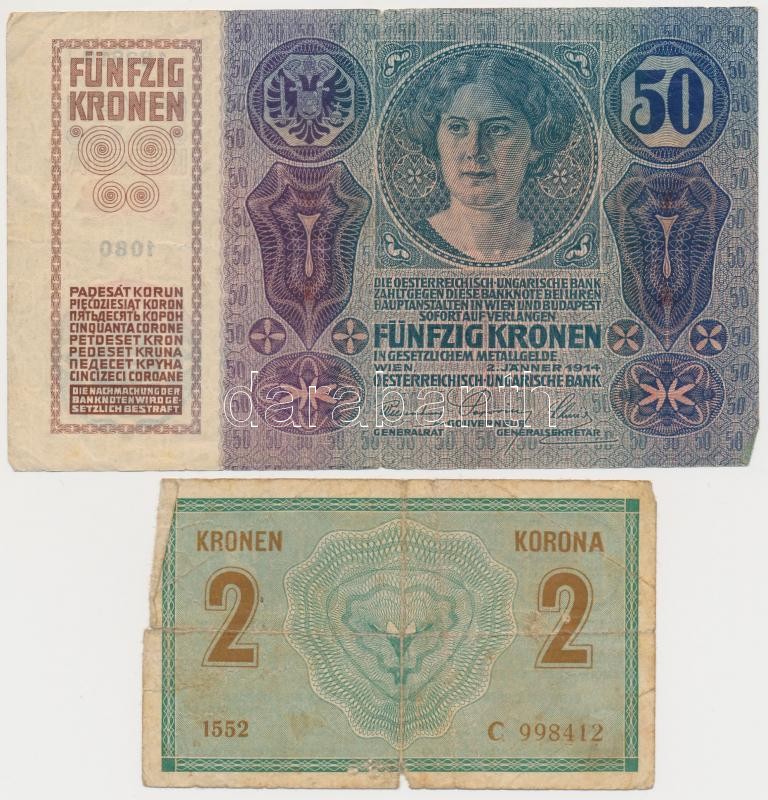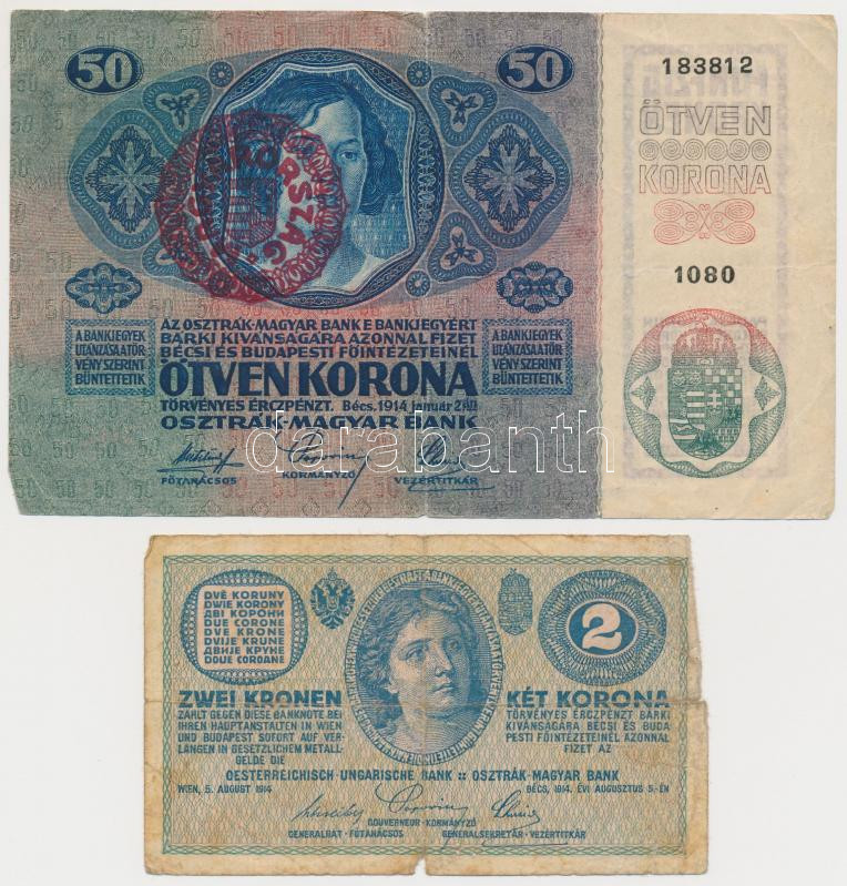 1914. 2K + 50K "MAGYARORSZÁG" felülbélyegzéssel T:III,III- https://www.darabanth.com/de/259-Fernauktion/259.0/Numismatik/Ungarische-Banknoten~100008/1914-2K-plus-50K-MAGYARORSZAG-felulbelyegzessel-TIII-III-~II1248241
