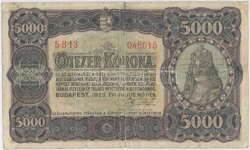 1923. 5000K nyomdahely nélkül, "T.W." jelöléssel T:III- https://www.darabanth.com/de/259-Fernauktion/259.0/Numismatik/Ungarische-Banknoten~100008/1923-5000K-nyomdahely-nelkul-TW-jelolessel-TIII-~II1272477