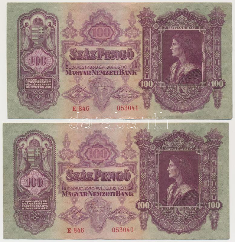 1930. 100P (4x) páronként sorszámkövetők és egyugrású sorszámúak T:I-,... https://www.darabanth.com/de/259-Fernauktion/259.0/Numismatik/Ungarische-Banknoten~100008/1930-100P-4x-paronkent-sorszamkovetok-es-egyugrasu-sorszamuak-TI-II~II1276545