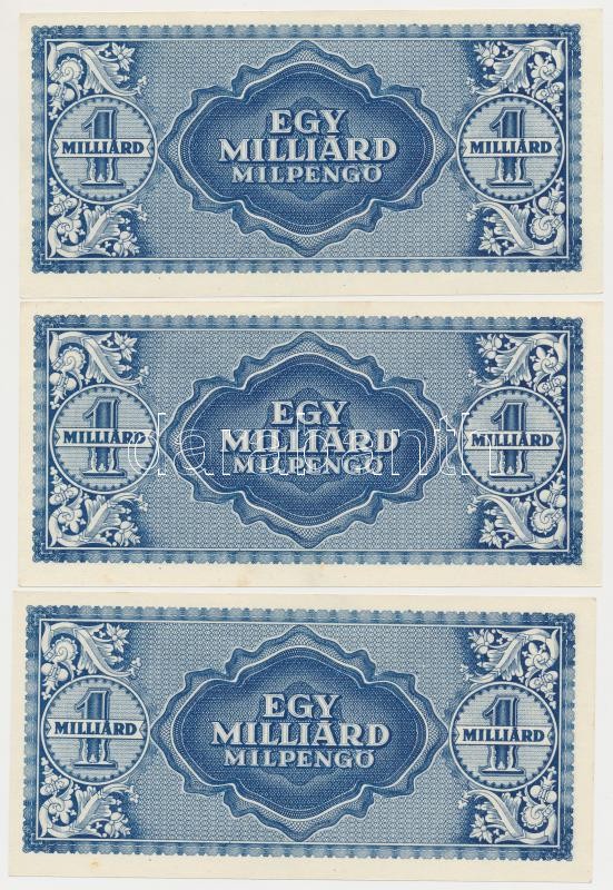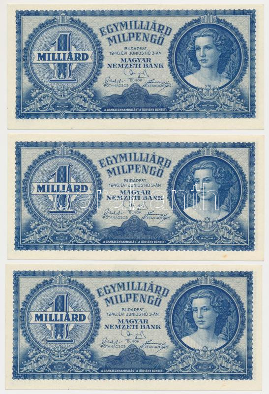 1946. 1.000.000.000MP (3x) T:I,I- https://www.darabanth.com/de/259-Fernauktion/259.0/Numismatik/Ungarische-Banknoten~100008/1946-1000000000MP-3x-TI-I-~II1272786