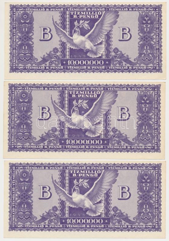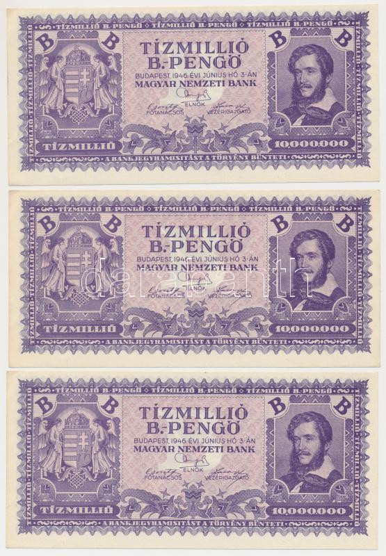 1946. 10.000.000BP (3x) T:I- https://www.darabanth.com/de/259-Fernauktion/259.0/Numismatik/Ungarische-Banknoten~100008/1946-10000000BP-3x-TI-~II1277397