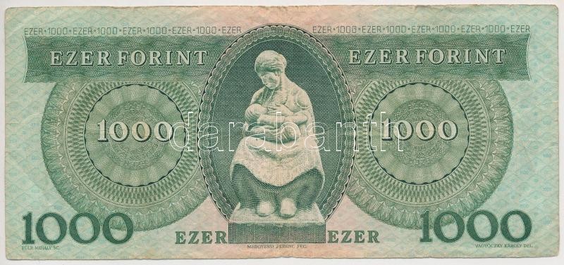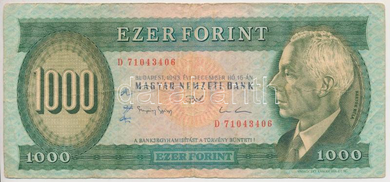 1993. 1000Ft "D" T:III,III- https://www.darabanth.com/de/259-Fernauktion/259.0/Numismatik/Ungarische-Banknoten~100008/1993-1000Ft-D-TIII-III-~II1278022