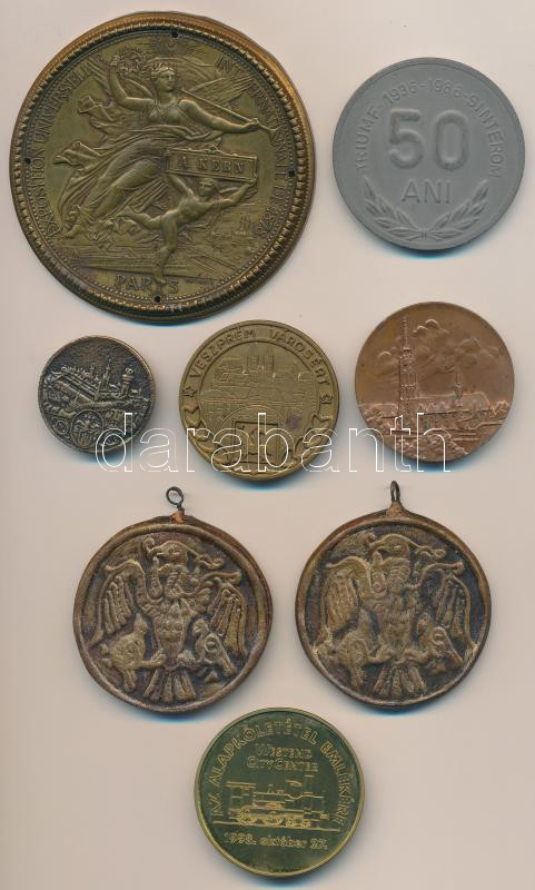 8db-os vegyes magyar és külföldi emlékérem tétel, benne "Veszprém városért", "Az alapkőletétel emlékére - Westend City Center", "Exposition Universelle Internationale de 1878 Paris" csak előlapi lemezérem T:vegyes