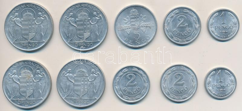 1941-1944. 1P Al (2x) + 1943. 2P Al (3x) + 5P Al "Horthy Miklós s... https://www.darabanth.com/de/259-Fernauktion/259.0/Numismatik/Ungarische-Munzen-und-Munzen-mit-ungarischem-Munzzeichen~100022/1941-1944-1P-Al-2x-plus-1943-2P-Al-3x-plus-5P-Al-Horthy-Miklos-szuletesenek-75-evforduloja-~II1277127
