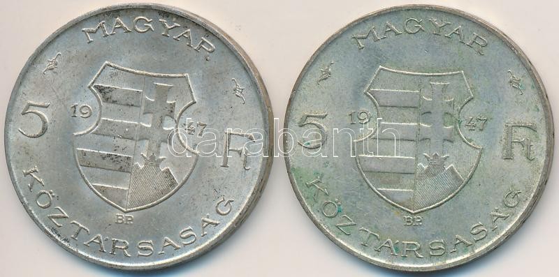 1947. 5Ft Ag "Kossuth" (2x) T:2- https://www.darabanth.com/de/259-Fernauktion/259.0/Numismatik/Ungarische-Munzen-und-Munzen-mit-ungarischem-Munzzeichen~100022/1947-5Ft-Ag-Kossuth-2x-T2-~II1274814