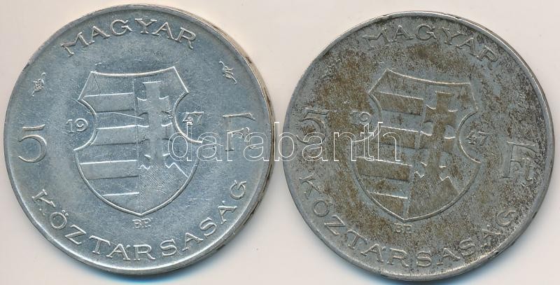 1947. 5Ft Ag "Kossuth" (2x) T:3 https://www.darabanth.com/de/259-Fernauktion/259.0/Numismatik/Ungarische-Munzen-und-Munzen-mit-ungarischem-Munzzeichen~100022/1947-5Ft-Ag-Kossuth-2x-T3~II1274824