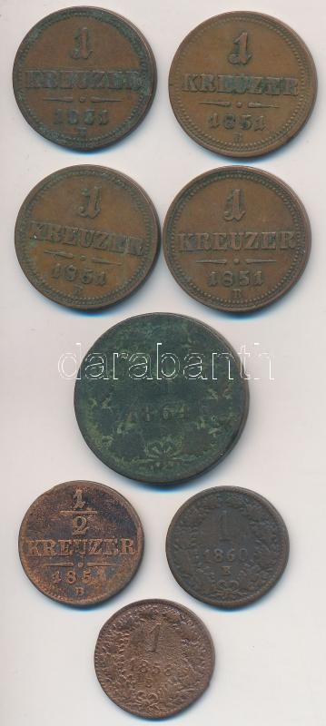 8db-os vegyes magyar krajcár tétel, közte 1851B 1/2kr Cu, 1kr Cu T:veg... https://www.darabanth.com/de/259-Fernauktion/259.0/Numismatik/Ungarische-Munzen-und-Munzen-mit-ungarischem-Munzzeichen~100022/8db-os-vegyes-magyar-krajcar-tetel-kozte-1851B-12kr-Cu-1kr-Cu-Tvegyes~II1272501