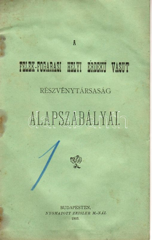 Beschreibung: 1903 A Felek-Fogarasi helyi érdekű vasut Rt. alapszabályai; Zeisler M. nyomdája
