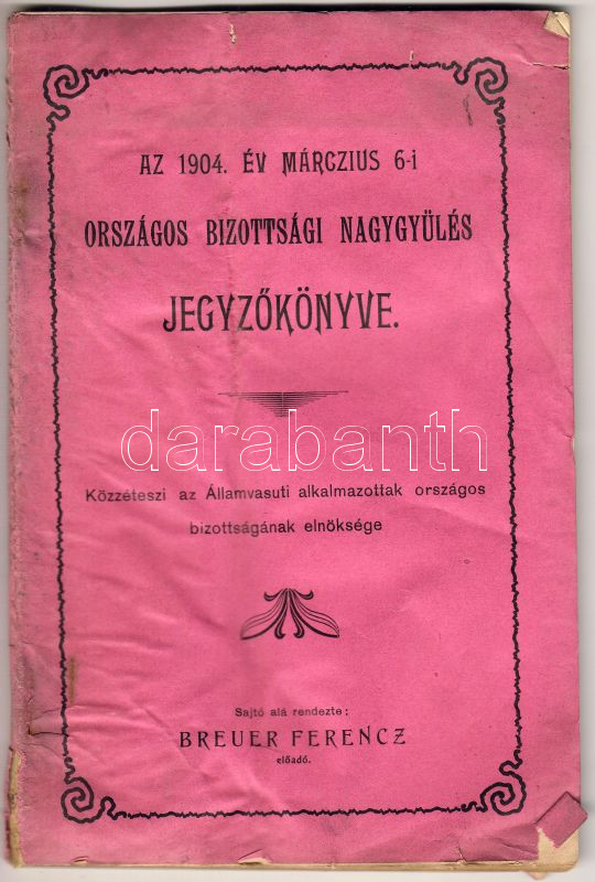 1904 Az államvasuti alkalmazottak országos bizottsága naggyűlési jegyz... https://www.darabanth.com/de/26-Fernauktion/26.0/Andere-Sammelgebiete/~97/1904-Az-allamvasuti-alkalmazottak-orszagos-bizottsaga-naggyulesi-jegyzokonyve-Engel-nyomda~II48959