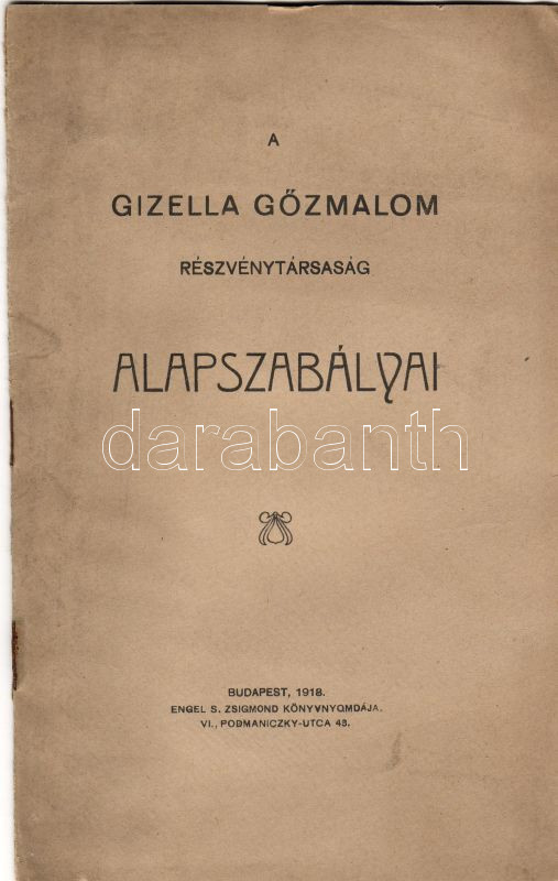 1918 A Gizella gőzmalom Rt. alapszabályai; Engel Zs. nyomdája https://www.darabanth.com/de/26-Fernauktion/26.0/Andere-Sammelgebiete/~97/1918-A-Gizella-gozmalom-Rt-alapszabalyai-Engel-Zs-nyomdaja~II48917