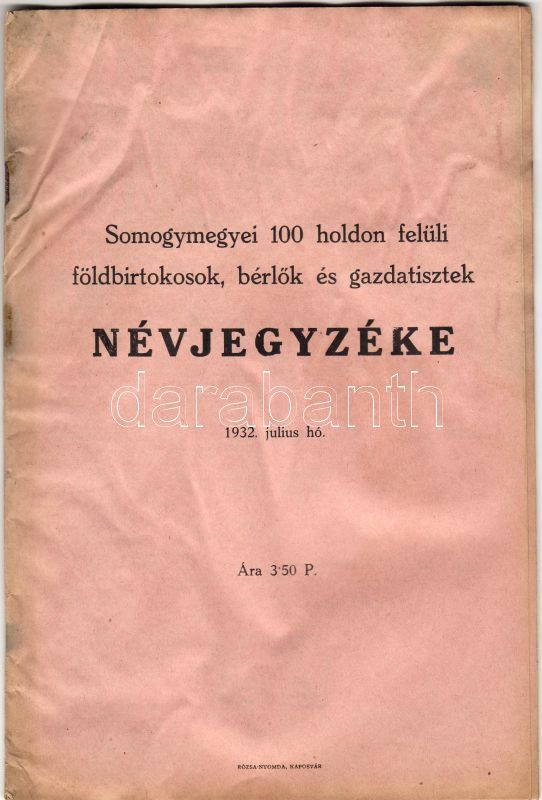 1932 A Somogy-megyei 100 holdon felüli földbirtokosok, bérlők és gazda... https://www.darabanth.com/de/26-Fernauktion/26.0/Andere-Sammelgebiete/~97/1932-A-Somogy-megyei-100-holdon-feluli-foldbirtokosok-berlok-es-gazdatisztek-nevjegyzeke-RC3~II48915