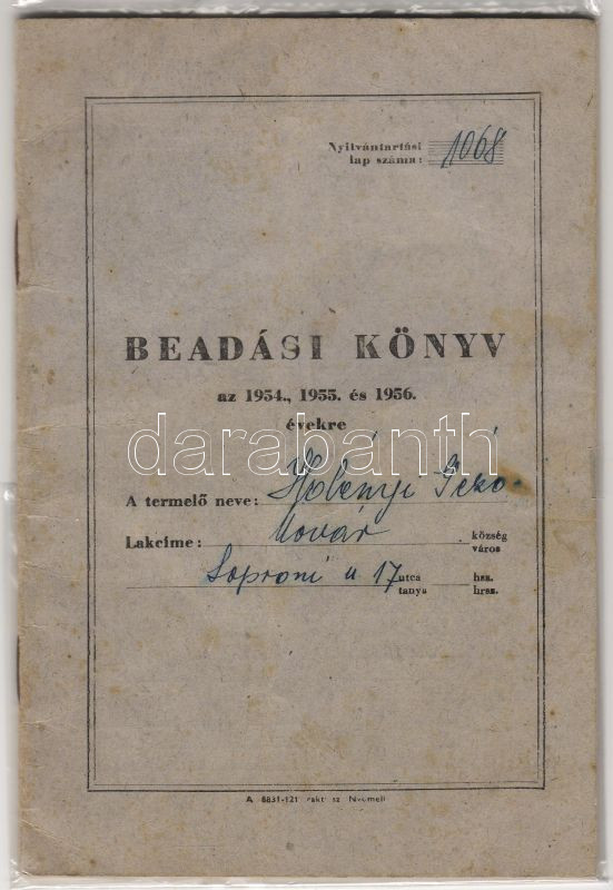 Beadási könyv 1954, 1955, 1956 évekre https://www.darabanth.com/de/26-Fernauktion/26.0/Andere-Sammelgebiete/~97/Beadasi-konyv-1954-1955-1956-evekre~II48678