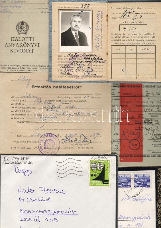 Véradó igazolvány, hímlő elleni oltási bizonyítványok (3db), 1913. értesítés halálesetről, halotti akv. kivonat (4db), magyar honos nők állandó lakh. kijelentője (1946) stb.