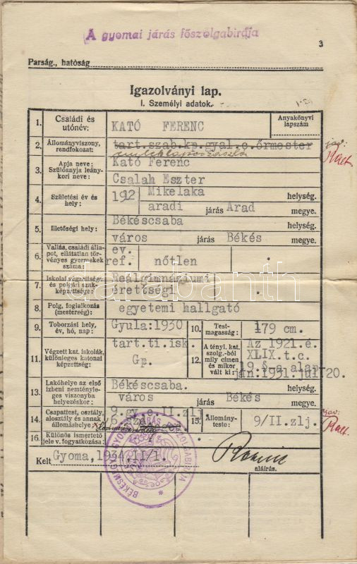 Beschreibung: Zászlós Igazolványi lapja és személyi adatai (1934.II.) Ugyanaz orosz hadifogságból hazatért százados 1947. évi kitöltött kérdőíve