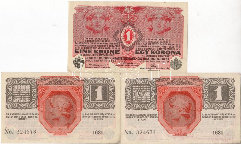 1918. 1K 3db folyamatos sorszám T:I/II (kicsi sarokhiba) https://www.darabanth.com/de/26-Fernauktion/26.0/Numismatik/~98/1918-1K-3db-folyamatos-sorszam-TIII-kicsi-sarokhiba~II48069