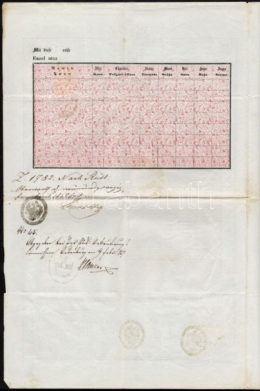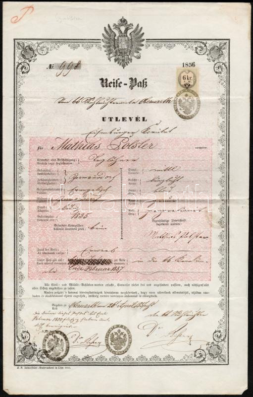 Beschreibung: 1856 Útlevél Gyimótfalvai illetőségű személy részére, 6kr CM okmánybélyeggel / 1856 Passport for Jormannsdorf (Burgenland) registered person