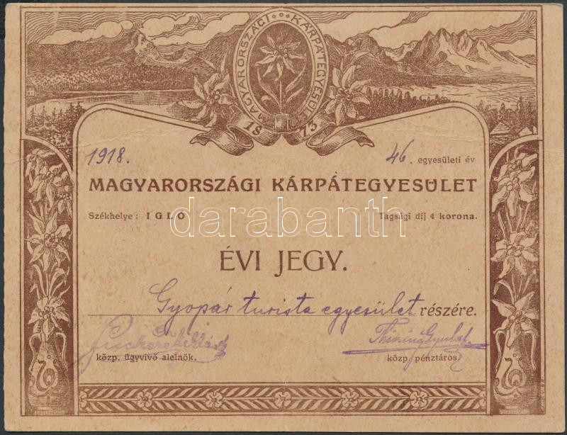 1918 Magyarországi Kárpátegyesület évi jegye, Gyopár Turistaegyesület részére, Fischer Miklós (1855-1930-) alelnök, Thirring Gyula (1881-?) pénztáros bélyegzett aláírásaival, középen hajtásnyommal./ 1918 Annual ticket of Hungarian Carpatian Society, for Tourist Association of Gyopár, with stamped signatures of Miklós Fisher (1855-1930) vice-president, and Gyula Thirring (1881-?) cashier.