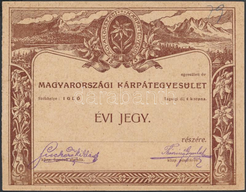 cca 1910 Magyarországi Kárpátegyesület évi jegye, kitöltetlen, Fischer Miklós (1855-1930-) alelnök, Thirring Gyula (1881-?) pénztáros bélyegzett aláírásaival. /