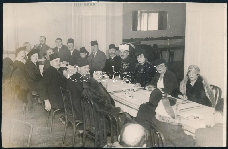 cca 1930 A Magyarországi Mohamedánok Asztaltársasága a főmuftival és Fémes Beck Mária szobrásznővel. Fotó stúdió, pecséttel jelzett sajtófotó. / Association of the Muslims in Hungary.. Press photo. 18x12 cm