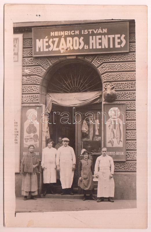 cca 1930 Bp., Heinrich István mészáros és hentes üzletportálja (VII. S... https://www.darabanth.com/de/26-Gross-Auktion/26.1/Andere-Sammelgebiete/Foto~10312/cca-1930-Bp-Heinrich-Istvan-meszaros-es-hentes-uzletportalja-VII-Szovetseg-u-11-hat~II1466807