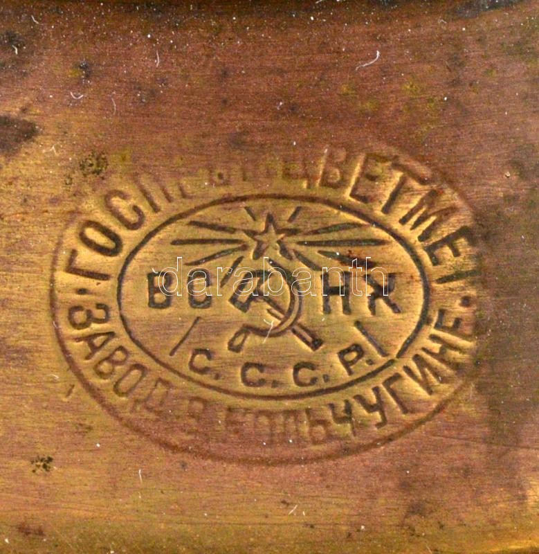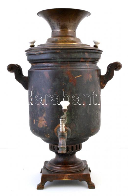 cca 1930 Kolchuginovoi szovjet réz szamovár, jelzett (Cvetmet), porcelán fogókkal, kopott, m: 45 cm /