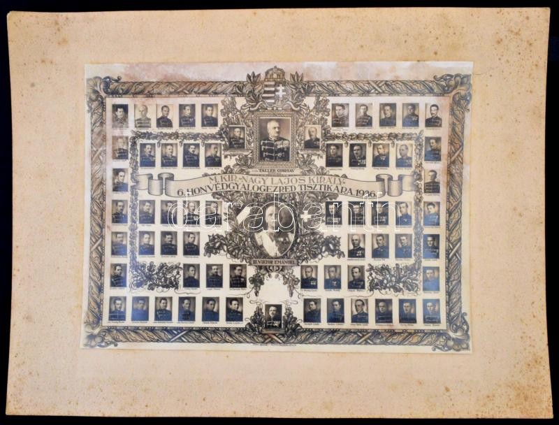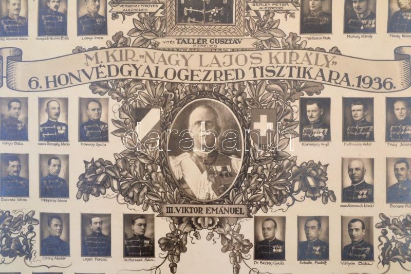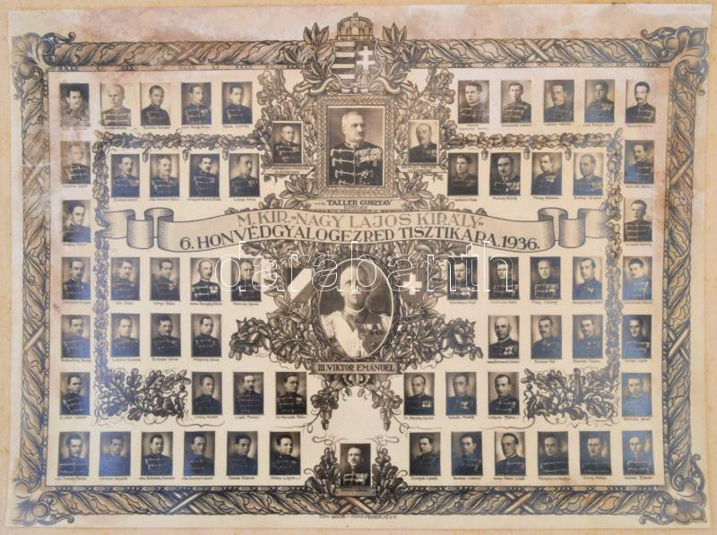 1936 A Nagy Lajos Király 6. Honvéd Gyalogezred Tisztikarának díszes nagyméretű tablófotója. Az összes tiszt feliratozott, dísz-egyenruhás képe, középen vitéz Tallér Gusztáv és III. Viktor Emánuel képe. / 1936 Large photo of the officers of the 6th infantry group. Cartboard size: 40x30 cm, Photo size 30x22 cm