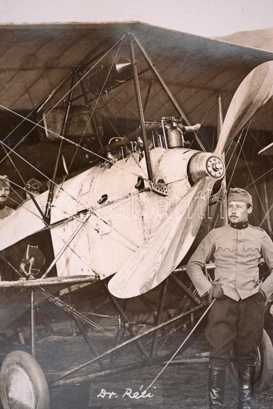 Hungarian military pilots in the First World War. dr. Réti and his plane Bömerang. 3 photo cards on album page.