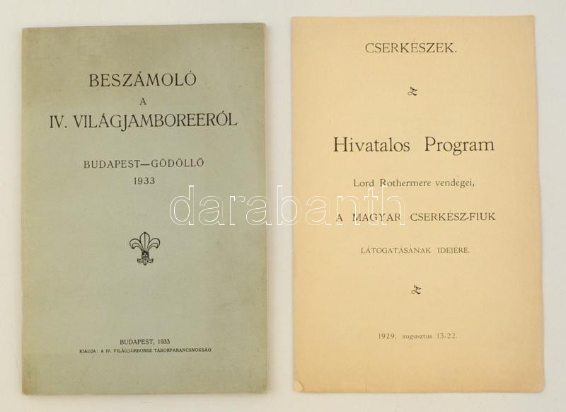 1929-1933 Beszámoló a IV. VIlágjamboreeról. Budapest-Gödöllő 1933. Bp., 1933, IV. Világjamboree Táborparancsnokság. Kiadói tűzött papírkötés, jó állapotban. + Cserkészek Hivatalos Program. Lord Rothermere vendége, a magyar cserkész-fiúk látogatásának idejére. 1929. augusztus 13-22. 4 p.