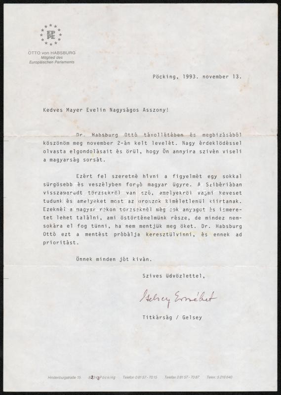 Beschreibung: 1993-1994 Habsburg Ottó illetve titkárnője, Gelsey Erzsébet aláírása magyar személy részére írt 2 db levélen
